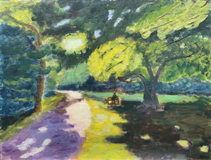 2026Licht filtert door de bomen van het Leidse plantsoen. Acryl op houten paneel.